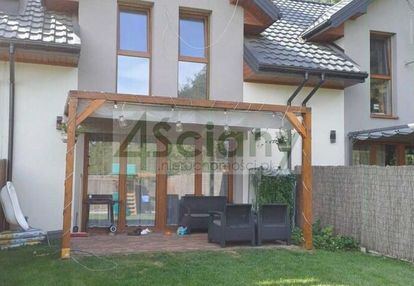 Z salonu wyjście na działkę wraz z tarasem, nad którym unosi się drewniane zadaszenie pokryte markizą, którą można odsłaniać lub zakrywać w słoneczne dni.