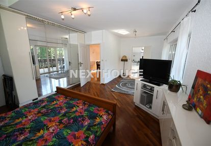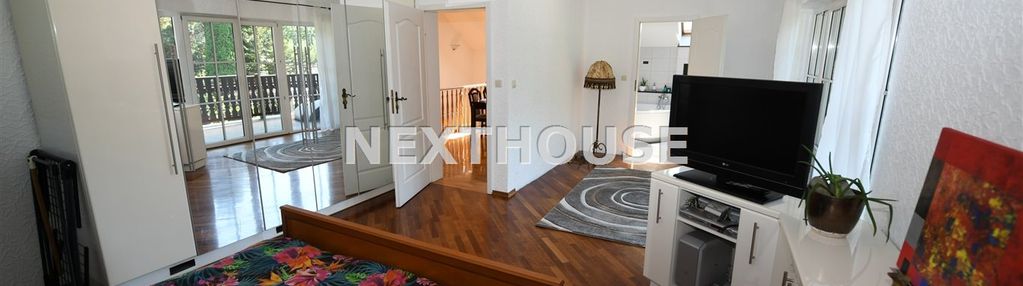 Na piętrze znajdziemy przestronną sypialnię, dodatkowy pokój, kuchnię i dwie łazienki. Dom ogrzewany jest kotłem gazowym dwufunkcyjnym Vaillant oraz kominkiem z rozprowadzeniem ciepła. Woda pochodzi z własnego ujęcia, a na podłogach położono parkiet i terakotę. Na terenie posesji znajduje się także wolnostojący dom drewniany o powierzchni 23 m2, który może służyć jako dodatkowe miejsce do rekreacji lub składowania,doskonale można je także zaadaptować pod saunę czy jacuzzi.
