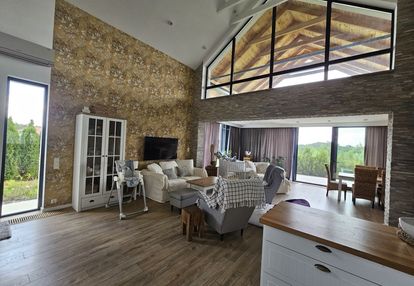 Rewelacyjna oferta - komfortowy, nowy dom położony w województwie warmińsko-mazurskim niecałe 10 km od Mrągowa nad jeziorem Narie. Budynek został posadowiony na skarpie, a ściana okien w salonie o wysokości 5,5 m zapewnia piękny widok na okolicę.