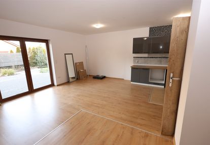 Salon z aneksem kuchennym: Przestronna, jasna przestrzeń sprzyjająca rodzinnym spotkaniom z wyjściem na ogród.