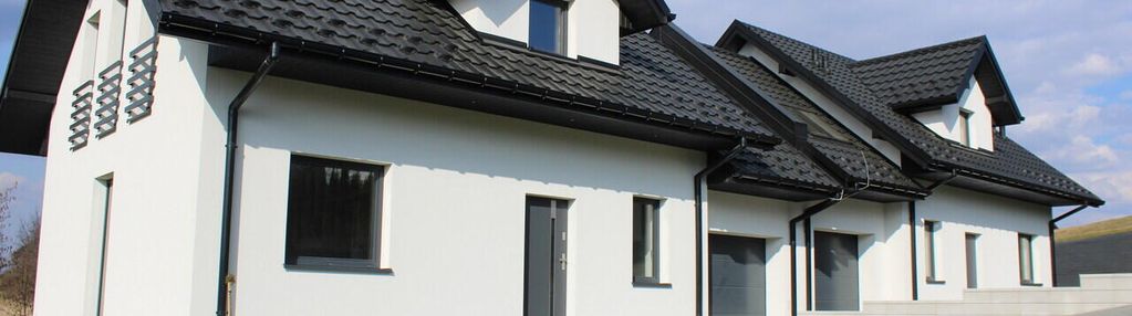 Dom z zewnątrz całkowicie wykończony - ocieplenie, elewacja, okna, drzwi wejściowe i brama garażowa, szeroka opaska z kostki, podjazd i dojście do budynku wybrukowane, zadbany trawnik