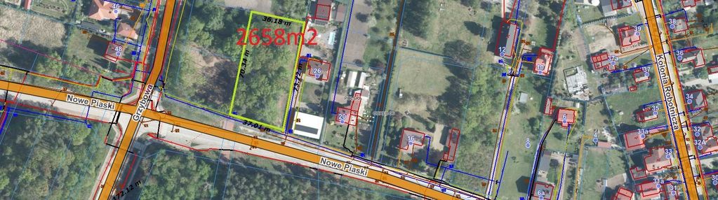 Działka o pow. 2658 m 2 nr ewidencyjny 46/4, obręb 06, kształt zbliżony do prostokąta, o wymiarach ok. 37m szeroka x 73mx 36mx 70m. Wjazd na działkę od ul. Nowe Piaski wyłożony kostką betonową. Ulica Nowe Piaski jest po modernizacji drogi, piękne pobocze ze ścieżką rowerową. Działka położona jest na delikatnym wzniesieniu,częściowo oczyszczona z drzew. w sąsiedztwie posesja nr 26.