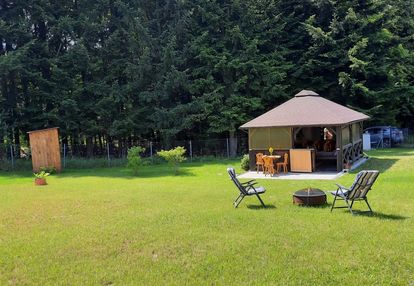 na działce znajduje się letnia altana mieszkalna , doskonała jako baza rekreacyjna na czas budowy lub miejsce do wypoczynku,