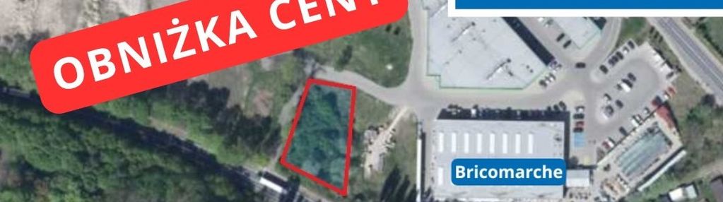 Obok działki centrum handlowe, market budowlany, garaże, osiedle mieszkaniowe.