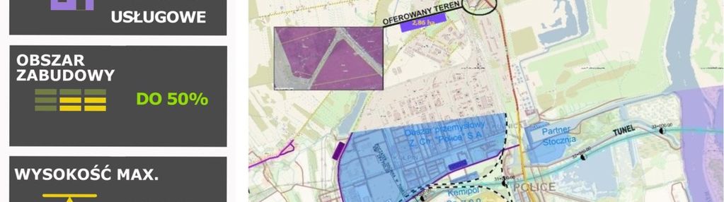 Mamy przyjemność zaprezentować Państwu atrakcyjny teren inwestycyjny o pow. ok. 2,86 ha, składający się z kilu działek w użytkowaniu wieczystym, położony w pobliżu Zakładów Chemicznych Police i Portu Police, w odległości ok. 2 km od planowanego tunelu Police-Święta, będącego częścią Zachodniego Obejścia Szczecina.