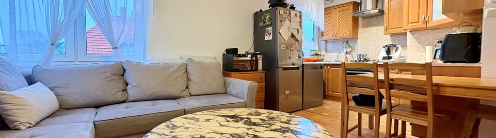 Mieszkanie składa się z jasnego salonu połączonego z aneksem kuchennym, dwóch sypialni, łazienki oraz przedpokoju. Do lokalu przynależą dwie duże piwnice, część strychu znajdująca się bezpośrednio nad mieszkaniem oraz dzierżawiony ogród do wyłącznego korzystania.