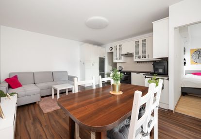 - salon z aneksem kuchennym z wyjściem na słoneczny duży balkon,