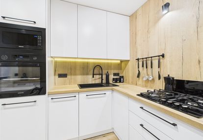 Kuchnia w nowoczesnej zabudowie, w pełni wyposażona w sprzęt AGD: