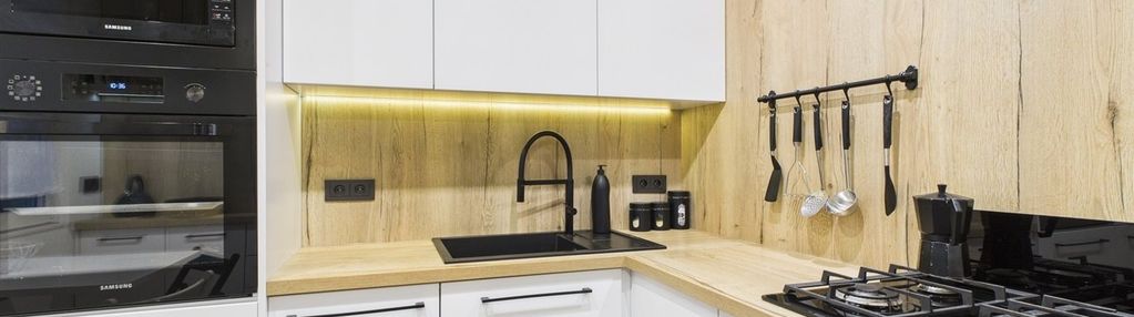 Kuchnia w nowoczesnej zabudowie, w pełni wyposażona w sprzęt AGD: