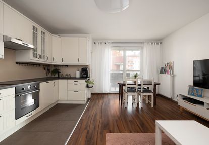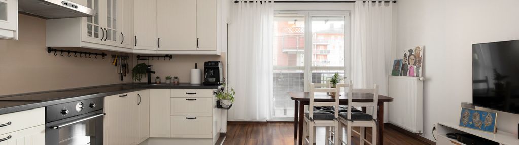 - salon z aneksem kuchennym z wyjściem na słoneczny duży balkon,
