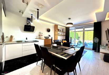 -Przestronny salon z aneksem kuchennym i wyjściem na taras oraz ogród.Wysokiej jakości kuchnia na wymiar z systemem mocowań Blum, w pełni wyposażona (płyta indukcyjna Electrolux, piekarnik Samsung, mikrofalówka, lodówka Samsung, zmywarka). W salonie znajduje się skórzana kanapa, rozkładany stół, telewizor Samsung, kino domowe oraz komfortowy fotel elektryczny. Nowoczesne oświetlenie led oraz klasyczne.