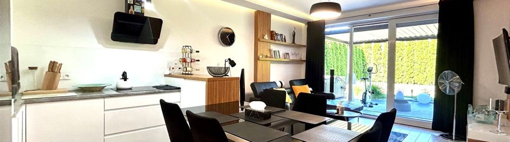-Przestronny salon z aneksem kuchennym i wyjściem na taras oraz ogród.Wysokiej jakości kuchnia na wymiar z systemem mocowań Blum, w pełni wyposażona (płyta indukcyjna Electrolux, piekarnik Samsung, mikrofalówka, lodówka Samsung, zmywarka). W salonie znajduje się skórzana kanapa, rozkładany stół, telewizor Samsung, kino domowe oraz komfortowy fotel elektryczny. Nowoczesne oświetlenie led oraz klasyczne.