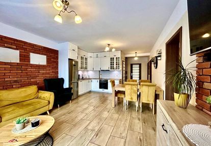 Mieszkanie zostało wykończone z najwyższą dbałością o detale - na ścianach znajdują się gładzie oraz ozdobna cegiełka, całość utrzymana w nowoczesnym stylu.