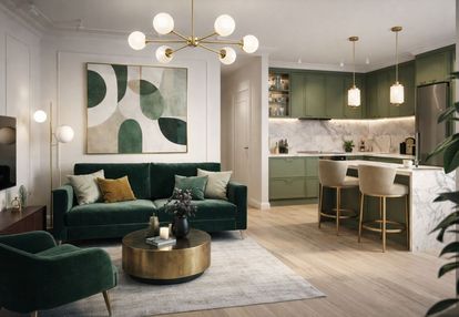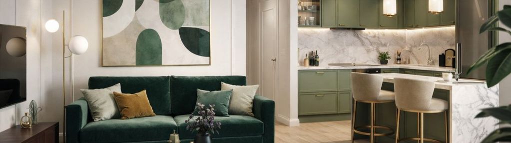 Mieszkanie doskonale sprawdzi się w stylu nowoczesnym z elementami eklektyzmu - elegancka zieleń, złote dodatki i naturalne materiały tworzą ponadczasowe, przytulne wnętrze.