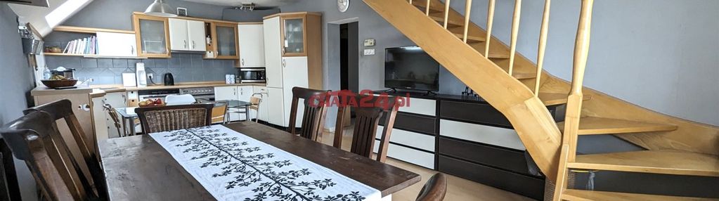 Jadalna (salon) wraz z aneksem kuchennym o pow. 23,10 m 2 . W pełni wyposażony aneks w sprzęt AGD (płyta indukcyjna, piekarnik, lodówka, zmywarka). Z wyjściem na loggię. Na wyposażeniu klimatyzacja. W kuchni częściowo ogrzewanie podłogowe .