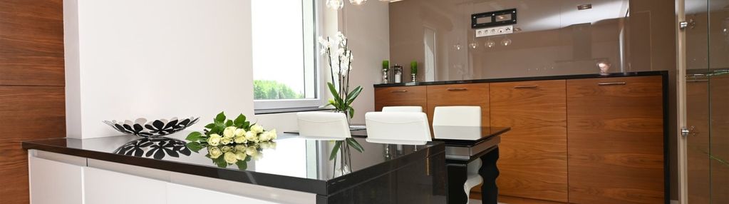 W kuchni -wysokiej klasy zabudowa pod wymiar z blatem z naturalnego granitu oraz pełne wyposażenie w sprzęt AGD (lodówka, piekarnik, płyta grzewcza, okap, zmywarka).