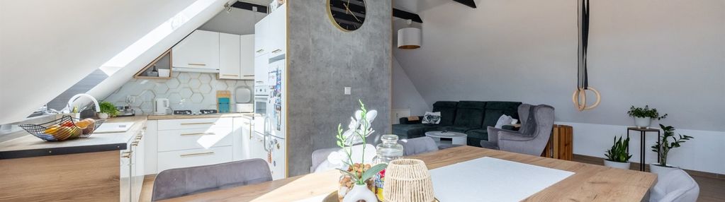 To mieszkanie zachwyca od pierwszej chwili - jest przestronne, ciepłe i pełne domowego klimatu. Centralnym punktem jest salon z jadalnią i aneksem kuchennym - niezwykle wysokie pomieszczenie (aż 4 m w najwyższym punkcie!), które tworzy niepowtarzalny klimat. To przestrzeń stworzona do rodzinnych spotkań, wspólnych posiłków i codziennego życia w komforcie.