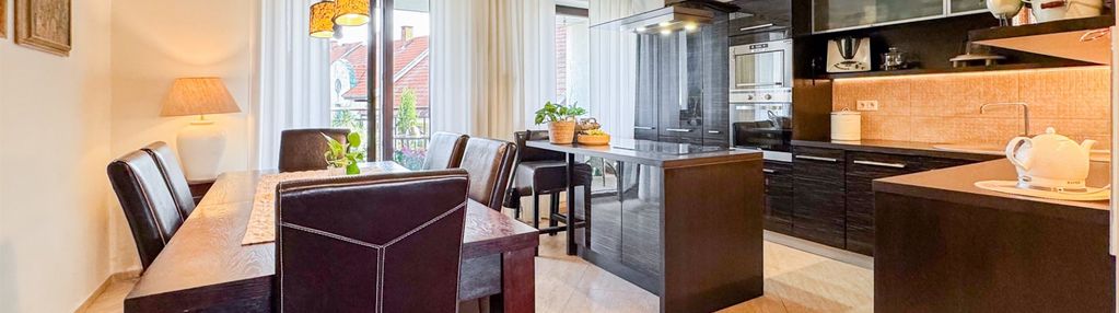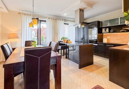 Kuchnia z aneksem i jadalnią - 19,70 m² To serce mieszkania — duża, jasna przestrzeń, która łączy funkcję gotowania, spożywania posiłków i codziennych spotkań domowników. Kuchnia wyposażona jest w pełny zestaw sprzętów AGD, a jadalnia z solidnym stołem kolonialnym i skórzanymi krzesłami tworzy elegancką, reprezentacyjną część wnętrza. Z kuchni prowadzi wyjście na przestronny balkon.