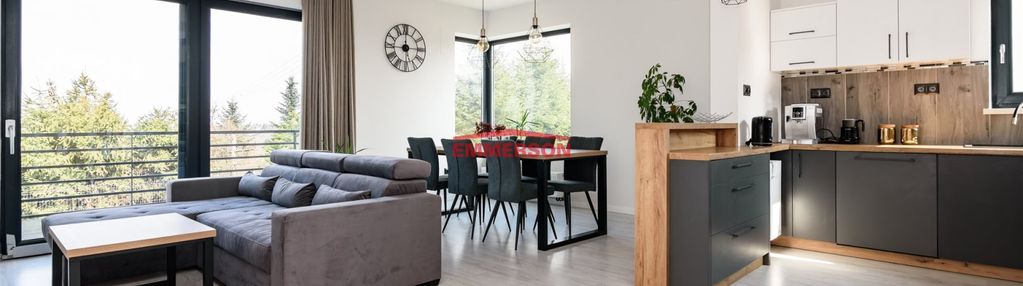 kuchnia: meble na wymiar z barem, lodówka z zamrażalnikiem, kuchenka indukcyjna, piekarnik, zmywarka, okap, kuchenka mikrofalowa w zabudowie, zlew, ekspres do kawy, czajnik oraz podstawowe wyposażenie (sztućce, zastawa stołowa, garnki itp.);