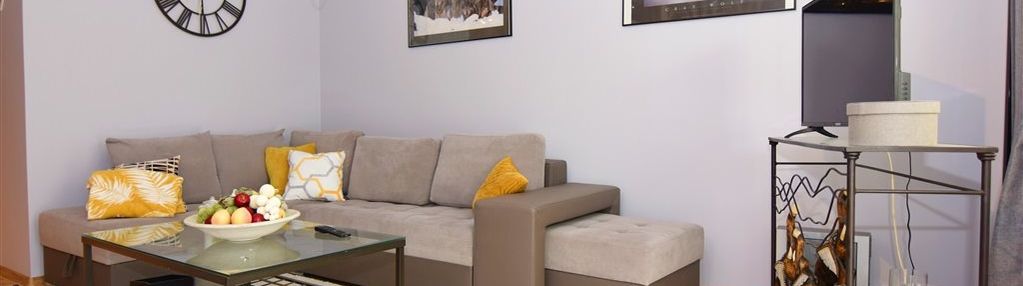 Mieszkanie w wysokim standardzie, w pełni wyposażone: zabudowa stała kuchni z AGD, telewizor LED; umeblowanie widoczne na zdjęciach.