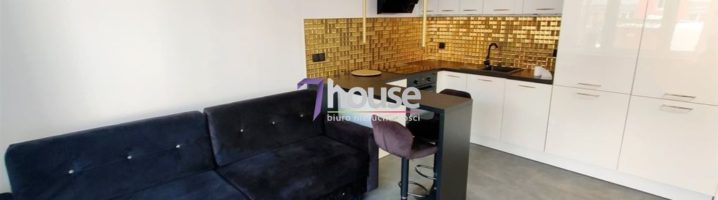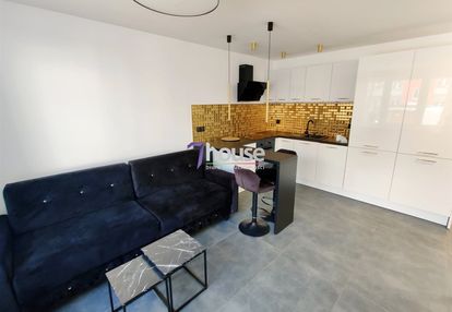 Kuchnia w zabudowie, wyposażona w sprzęt AGD, z nowoczesnym blatem i efektowną złotą mozaiką. W salonie wygodna sofa, miejsce na strefę wypoczynkową oraz jadalnianą. Stylowe oświetlenie nadaje wnętrzu elegancji i charakteru. Sypialnia z dużym, komfortowym łóżkiem, zapewniająca ciszę i komfort wypoczynku.